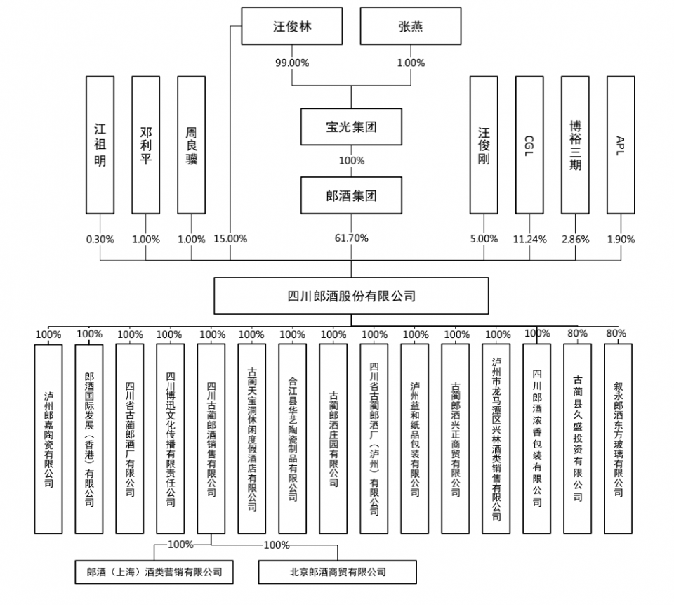 郎酒集团、汪俊林、汪俊刚分别直接持有公司61.70%、15.00%、5.00%的股权。张燕持有宝光集团1%的股权,间接持股公司。汪氏家族直接或间接控股达81.70%。