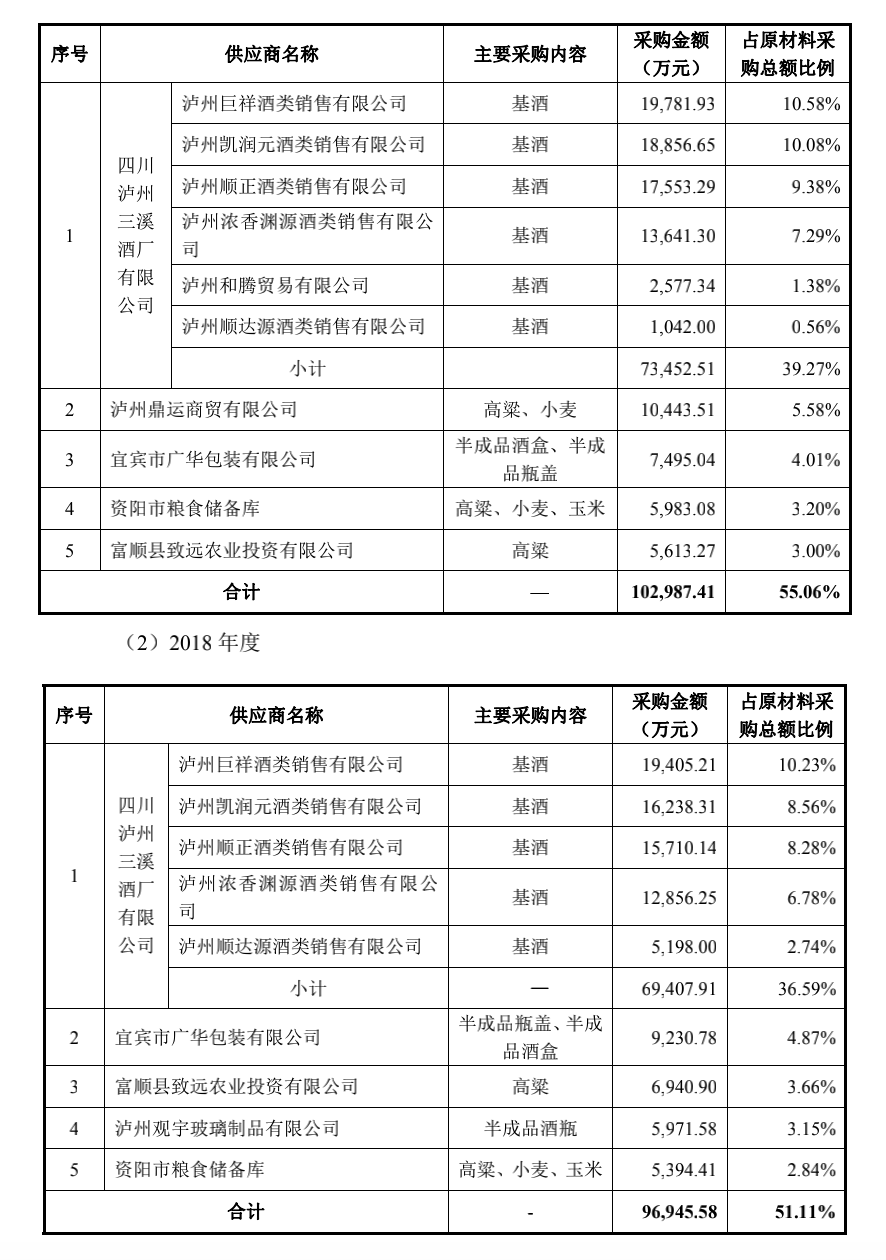 而该第一大供应商的实际控制人即为股东之一的周良骥。对此,郎酒股份认为,公司不存在向单个供应商采购或者受同一实际控制人控制的供应商累计采购金额超过当期采购总额 50%的情形,也不存在严重依赖少数供应商的情形。