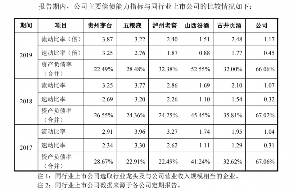 此外,令人瞩目的是,郎酒股份的债务问题较为突出。报告期内,郎酒股份的资产负债率分别为67.06%、67.02%、66.06%,大幅高于同期同行业上市公司。截至招股书签署日,郎酒集团、永盛投资为郎酒股份担保尚未履行完毕的借款余额达10亿元。
