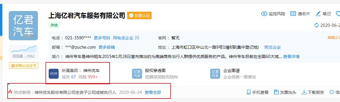 资料显示:上海亿君汽车服务有限公司成立于2014年12月,法定代表人为曾庆祝,公司经营范围包括机动车驾驶服务,商务咨询,该公司为神州优车股份有限公司的全资子公司。