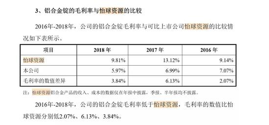 但在2016年—2018年间,怡球资源的铝合金锭业务突然发力,因开辟了新的原材料渠道,将毛利率大幅提升,三年间,其毛利率分别上攀至9.14%、13.12%、9.81%,而反观顺博合金,其主要收入来源——铝合金锭的毛利率分别仅为7.07%、6.99%、5.97%,不仅依然在4%-7%的区间内波动,反而愈加走低,与怡球资源的差距进一步扩大。