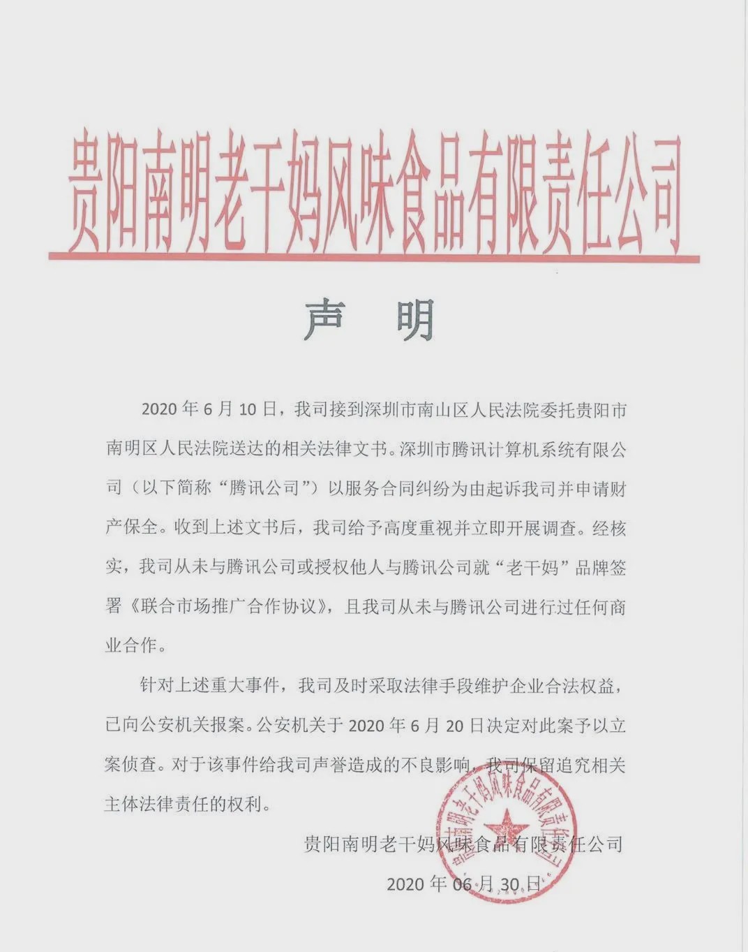 老干妈则发布声明称,经核实公司从未与腾讯公司或授权让人与腾讯公司就"老干妈"品牌签署《联合市场推广合作协议》,且从未与腾讯公司进行过任何商业合作,针对上述重大案件,已向公安机关报案。