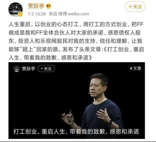 7月2日上午,乐视网创始人贾跃亭在微博上发布名为《打工创业、重启人生,带着我的致歉、感恩和承诺》的致歉信,信中称其在美国申请的个人破产重组程序终于完成,重组方案正式生效,同时债权人信托也正式设立并开始运营。他同时表示,将补偿乐视网股民,而自己将打工创业、重启人生。