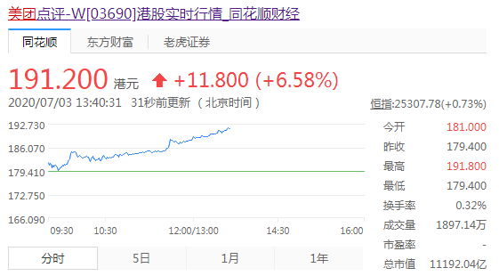 7月3日,美团的股票继续创新高。截止发稿前,美团股价已暴涨至191.2港元,涨幅为6.58%。
