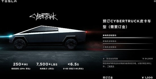 科创 炫目!电动皮卡来了,特斯拉重金打造,国内订金1000元! 2020-07-04 10:27:09 分享 新浪科技讯 7月4日上午消息,据特斯拉中国官网显示,公司已经在中国开放了电动皮卡Cybertruck的预订,订金为1000元人民币。 特斯拉共提供三款CyberTruck,分别是单电机后轮驱动、双电机全轮驱动和三电机全轮驱动型号。 据了解,特斯拉于去年10月发布了电动皮卡Cybertruck,售价从3.99万-6.99万美元不等。Wedbush证券分析师6月份曾预计,Cybertruck的预定量已经超过65万辆。