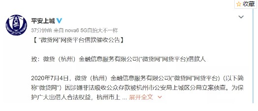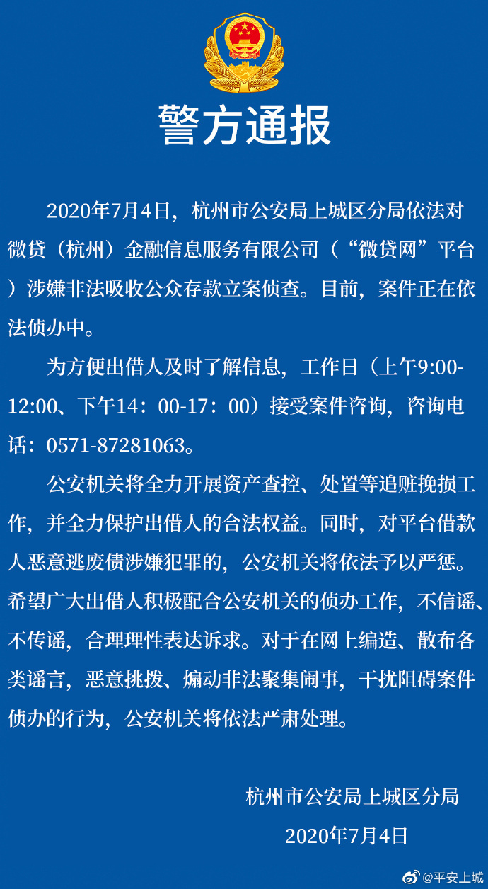 随后,警方又在微博发文,敦促通过微贷网进行借款且尚未还款的借款人积极主动归还借款。