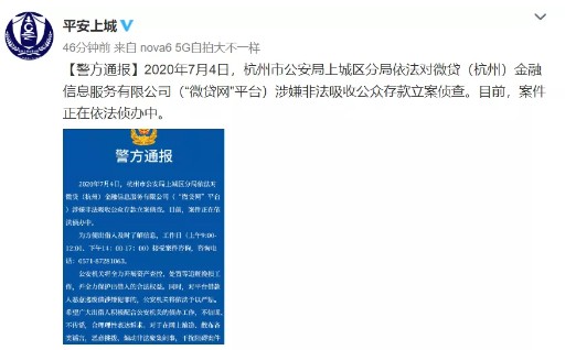 据每经新闻报道2020年7月4日深夜,杭州市公安局上城区分局依法对微贷(杭州)金融信息服务有限公司(“微贷网”平台)涉嫌非法吸收公众存款立案侦查。 目前,案件正在依法侦办中。