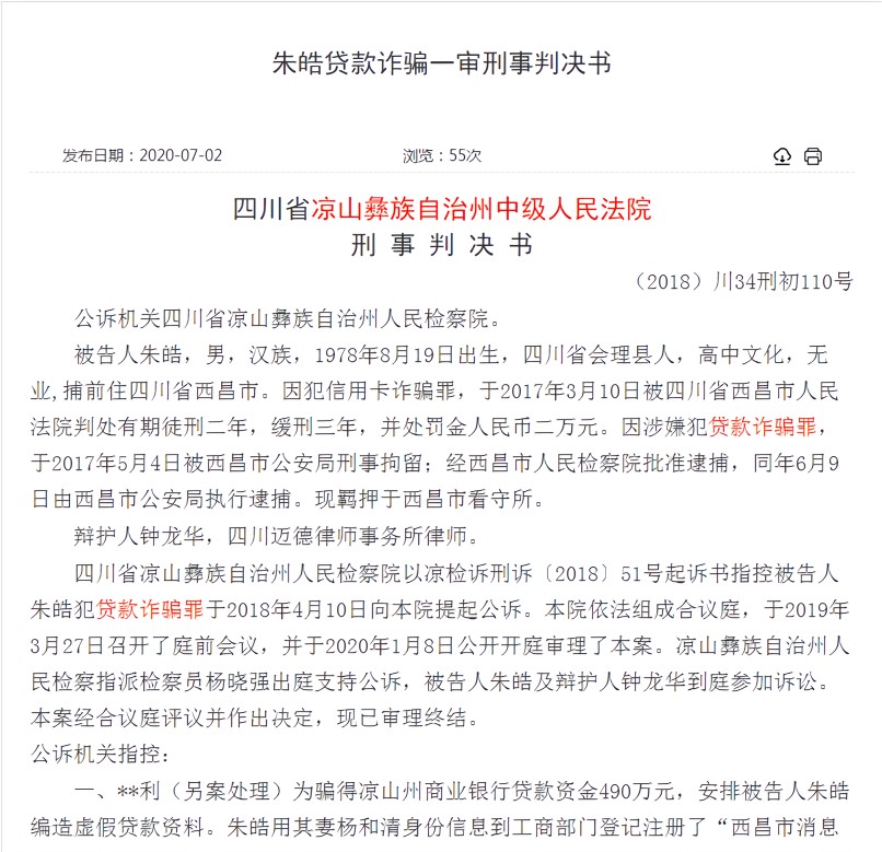 此外,朱皓还借他人身份证成立新公司,到凉山州商业银行申请贷款。根据朱皓供述,部分贷款身份证是曾溢、毛某等人找来,委托其成立公司并向银行贷款,部分使用自己亲属的身份证成立公司贷款。