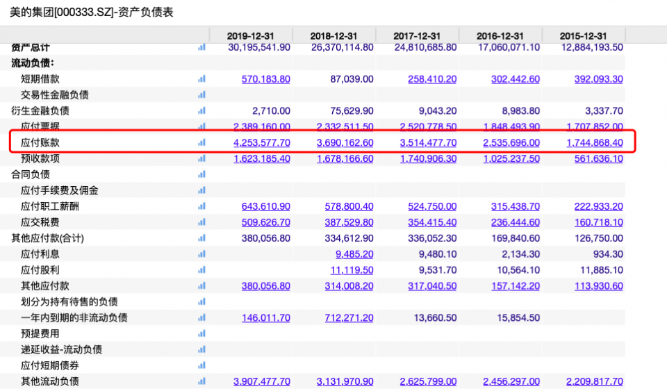 美的集团2019年年报显示,截至2019年末公司应付账款为425.36亿,同比增长15.27%;2015-2018年四年间的应付账款分别为174.49亿、253.57亿、351.45亿和369.02亿。也就是说,从2015年到2019年,美的的应付账款翻了不止一倍。