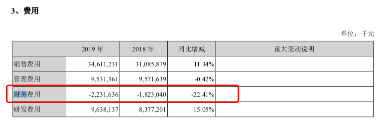 图注:美的集团2018年和2019年财务费用(来源:美的集团2019年年报)