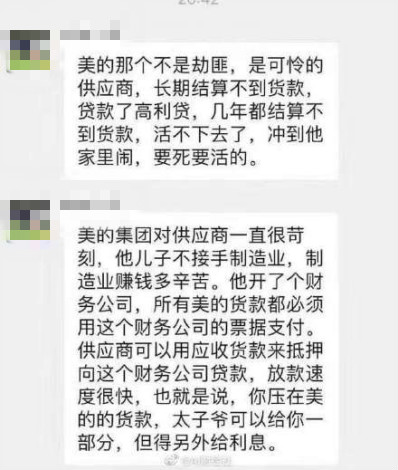 等待货款的时间漫长加之手头没有充裕现金,久而久之供应商们难免陷入周转困难的境地;而此前网上流传的聊天截图中似乎也证实了这种情况的存在—该聊天截图称美的集团“对供应商一直很苛刻,他儿子(何剑锋)不接手制造业,制造业赚钱很辛苦。他开了财务公司,所有美的贷款都必须用这个财务公司的票据支付。供应商可以用应收账款来抵押向这个财务公司贷款,也就是说,你压在美的的货款,‘太子爷’可以给你一部分,但得另外给利息。”