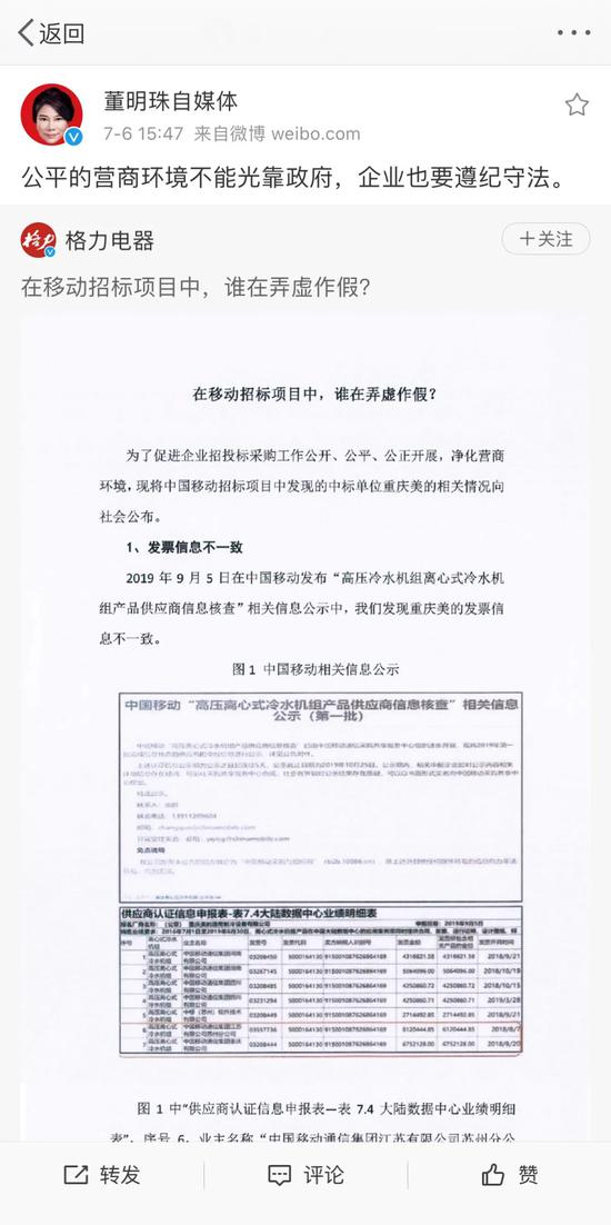 同时表示格力曾就相关问题多次向中国移动反馈,为什么存在这么多问题的情况下,重庆美的还能屡次中标,甚至屡次唯一中标?