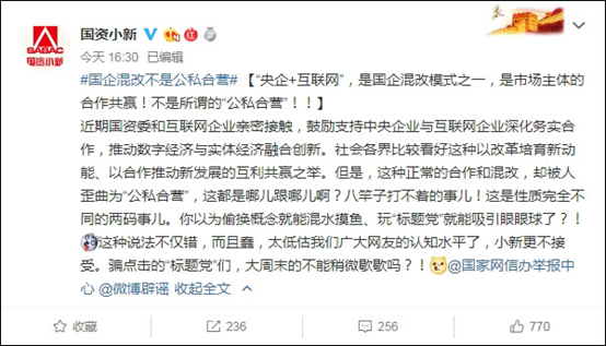对此,国资委官方微博——“国资小新”昨日表示:“近期国资委和互联网企业亲密接触,鼓励支持中央企业与互联网企业深化务实合作,推动数字经济与实体经济融合创新。社会各界比较看好这种以改革培育新动能、以合作推动新发展的互利共赢之举。但是,这种正常的合作和混改,却被人歪曲为‘公私合营’,这都是哪儿跟哪儿啊?八竿子打不着的事儿!这是性质完全不同的两码事儿。你以为偷换概念就能混水摸鱼、玩‘标题党’就能吸引眼球了?!这种说法不仅错,而且蠢,太低估我们广大网友的认知水平了,小新更不接受。骗点击的‘标题党’们,大周末的不能稍微歇歇吗?!”