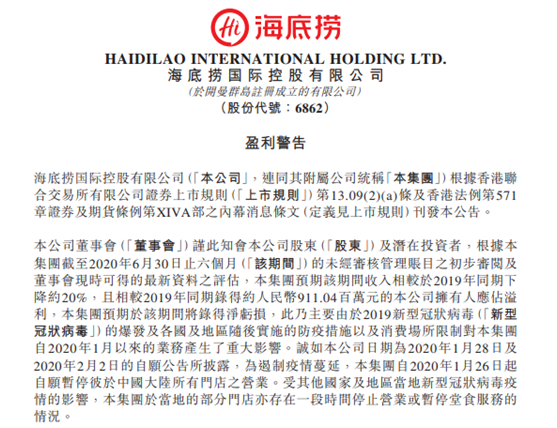 7月6日晚间,在港上市的海底捞发布盈利警告,公司预计2020年上半年收入较2019年同期下降约20%,较2019年同期录得约9.11亿元的公司拥有人应占溢利,预期公司于该期间将录得净亏损。