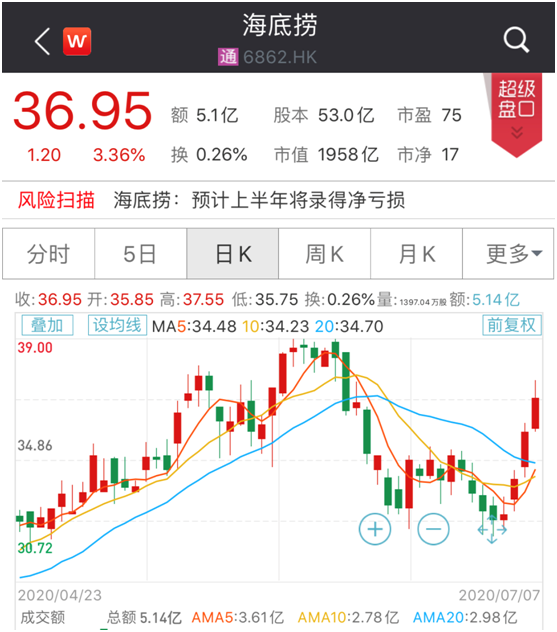 据中国基金报报道 7月6日晚间,海底捞发布了上半年的业绩预告,称受疫情影响,该期间收入相较于2019年同期下降约20%,且由盈转亏。资本市场上,盈利警告对海底捞走势似乎影响不大,7月7日港股开盘,该股早间小幅高开,随后股价冲高一度涨超4%,不过很快回落, 截至7月7日收盘,港股上市公司海底捞股价涨3.36%,报36.95港元/股。