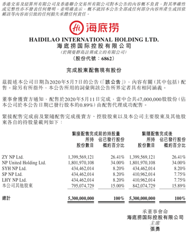 5月7日,海底捞发布公告称,股东SP NP Ltd.及LHY NP Ltd.拟以每股33.2港元的价格配售4700万股股份,占公司已发行股本0.89%,该配售计划将于2020年5月11日上午9时完成。