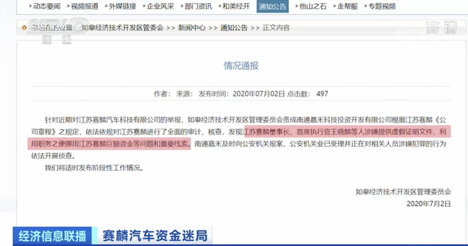 7月2日,江苏省如皋经济开发区管委会通报显示,江苏赛麟董事长王晓麟等人因涉嫌提供虚假证明文件、挪用巨额资产等问题,已被公安机关立案侦查。