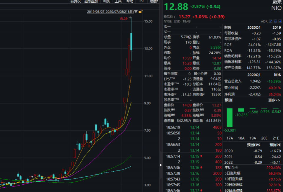 我们再看看大家关注的另一只中概股蔚来汽车,昨夜的走势可谓过山车,从一度暴涨逾15%到收盘下跌2.57%。盘中,蔚来汽车的市值一度突破1200亿,而比亚迪市值也才2000亿出头,也就是说,蔚来汽车相当于三分之二个比亚迪。事实上,尽管昨夜巨幅震荡,不过,近一个多月以来,蔚来汽车竟暴涨了300%。
