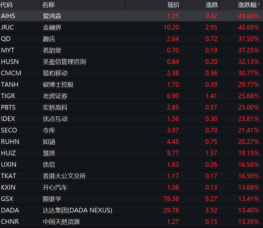 另外,其他中概股表现也十分强势,爱鸿森涨近50%,蓝城兄弟上市首日上涨46%,金融界涨超40%,趣店涨超36%,猎豹移动和瑞幸粉单涨超30%,老虎证券涨超25%,如涵涨超20%,达达涨超13%。