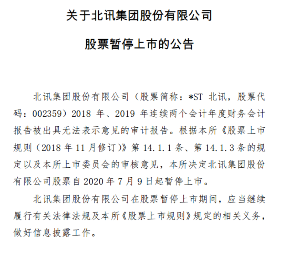 6月24日,*ST北讯披露了2019年年报。由于公司2018年度财务报告被出具了无法表示意见的审计报告,且2018年净利润为负值,公司股票已于2019年5月6日起被实施退市风险警示。加之公司2018年、2019年连续两年审计报告的审计意见类型均为无法表示意见,且2018年、2019年净利润连续两年为负值,公司在6月24日披露2019年年报后即开始停牌,等待交易所作出是否暂停公司股票上市的决定。