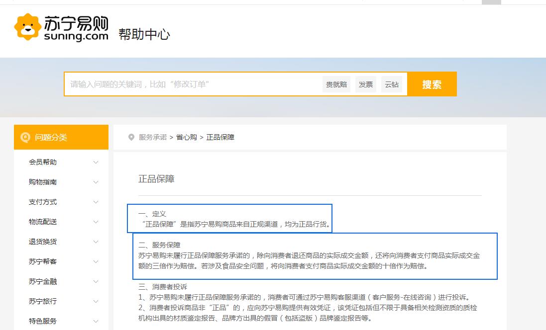 而法院查明,苏宁易购网站“服务承诺>省心购>正品保障”页面载明:一、定义,“正品保障”是指苏宁易购商品来自正规渠道,均为正品行货。二、服务保障,苏宁易购未履行正品保障服务承诺的,除向消费者退还商品的实际成交金额,还将向消费者支付商品实际成交金额的三倍作为赔偿。