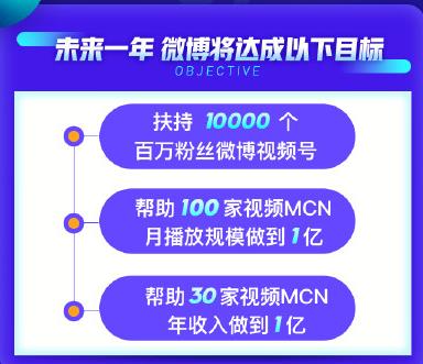 根据微博官方公布的信息称:未来一年,微博视频号和机构达成打造10000个百万粉视频号,重点聚焦垂直领域;扶持100家视频MCN机构,月播放规模做到1亿;帮助30家视频MCN机构,年收入做到1亿。