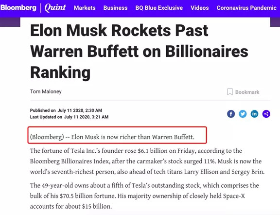 据Bloomberg quint数据,马斯克身家已经达到了705亿美元,不仅超越了巴菲特,还超越了中国首富马化腾、甲骨文创始人拉里·埃里森、谷歌创始人谢尔盖·布林。