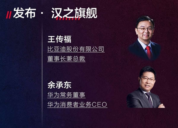 据凤凰财经讯 7月12日晚间,比亚迪汉新能源旗舰汽车正式上市,华为消费者CEO余承东也亲自现身发布会,与比亚迪总裁王传福同框,为新品打Call。