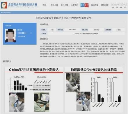全国青少年科技创新大赛官网显示,该项目简介声称,通过遗传学比较分析,本项目前期发现了一种关键突变基因C10orf67,并构建了其基因敲除小鼠;通过临床样本解析等后续研究发现,该基因在结直肠癌中高表达,敲低其表达,可以显著抑制细胞的增殖;进一步研究发现,该基因可调节结直肠癌细胞对化疗药物的敏感性。