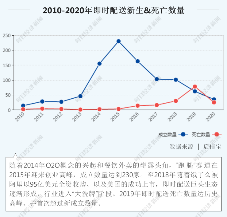 《每日经济新闻》记者通过启信宝数据库,梳理了近十年(2010-2020年)即时配送相关公司的工商注册与注销名单发现,在过去的十年中,总共有922家新注册成立的即时配送相关公司,死亡(注销)172家公司。