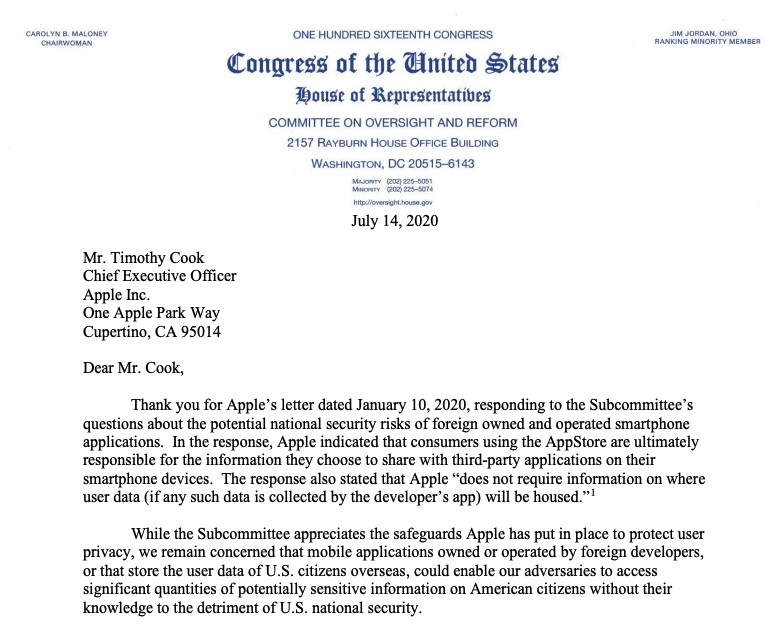 美国国会众议院监督与改革委员会致信苹果CEO蒂姆·库克(Tim Cook)、谷歌CEO桑达尔·皮查伊(Sundar Pichai),表达了对于他们把用户数据存储在外国所产生安全影响的担忧。