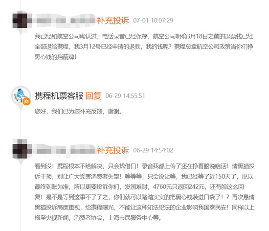 乘客于7月1日更新的投诉显示,他已经和航空公司确认,航空公司已经全款退给携程,并怀疑携程以航空公司的政策作为挡箭牌来牟利。