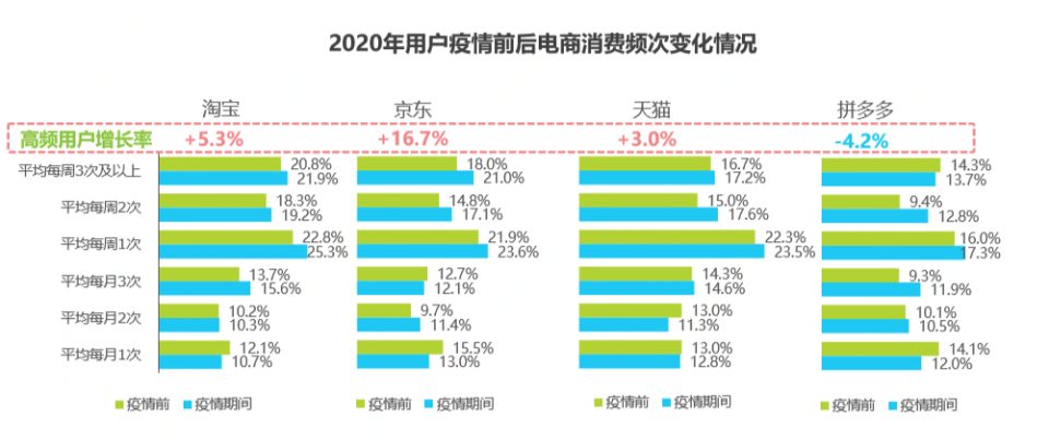 据报告公布的数据显示,在该报告检测期间,淘宝平台的高频用户增长率为5.3%;京东平台的高频用户增长率为16.7%;天猫平台的高频用户增长率为3%;而拼多多的高频用户增长率则下降了4.2%。