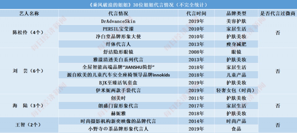 据每经记者通过公开资料不完全统计,30位姐姐中,除李斯丹妮、袁咏琳、黄龄、郑希怡、朱婧汐、丁当、许飞7位姐姐未查询到其代言情况外,其余23位姐姐共有超160款代言。