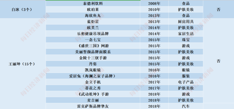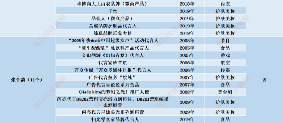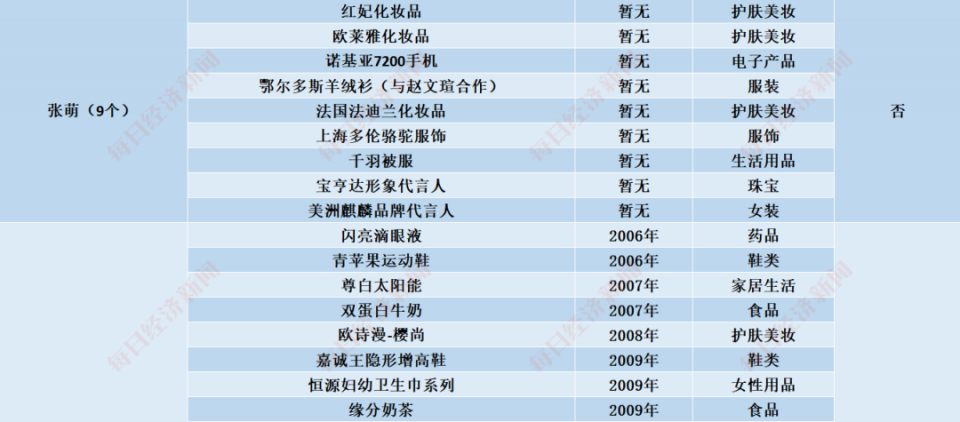 白冰、王丽坤、张萌、吴昕、张雨绮、黄圣依、张含韵代言情况