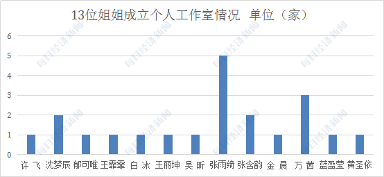 据每经记者不完全统计,30位姐姐中有13位姐姐成立了个人工作室,有的更是不止一家。许飞、郁可唯、王霏霏、白冰、王丽坤、吴昕、金晨、蓝盈莹、黄圣依均拥有1家个人工作室。这些姐姐们中,除郁可唯工作室是其母亲持股外,其他姐姐们都是自己100%持有工作室股份。