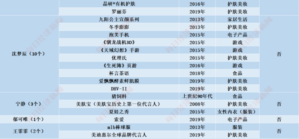陈松伶、刘芸、海陆、王智、阿朵、钟丽缇、沈梦辰、宁静、郁可唯、王霏霏代言情况