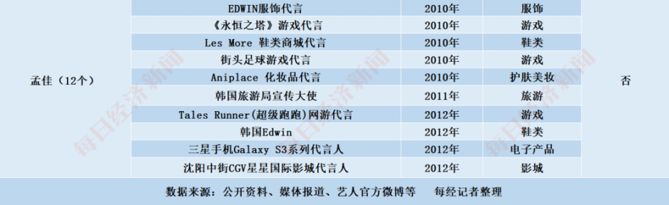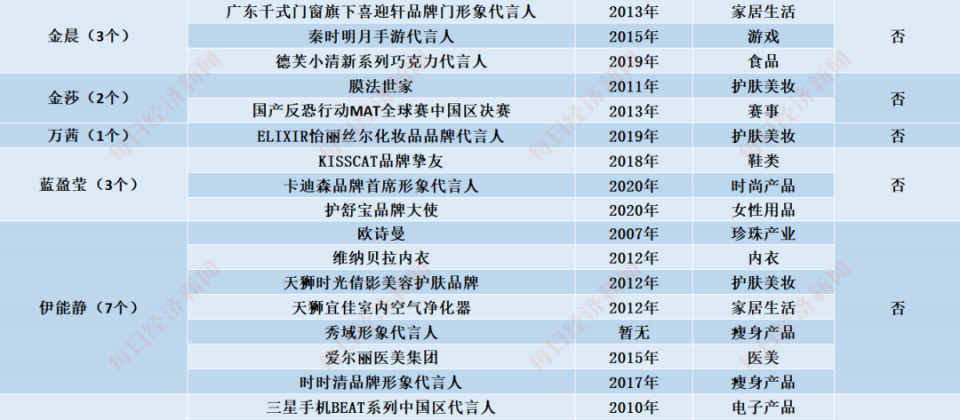 金晨、金莎、万茜、蓝盈莹、伊能静、孟佳代言情况