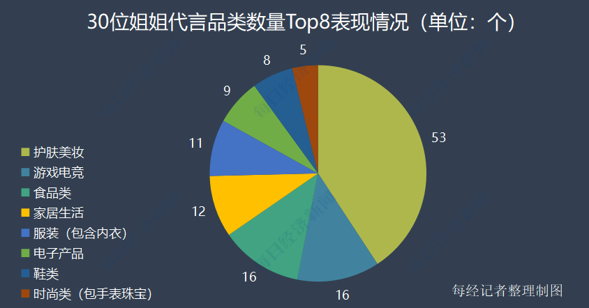 在代言类型上,姐姐们涉及的领域也十分广阔,包括护肤、美妆、时尚、食品、游戏、电子产品、家居生活、服装、电器、汽车、女性用品、赛事等多个领域。代言品类top8分别为护肤美妆、游戏电竞、食品类、家居生活、服装、电子产品、鞋类、时尚产品。