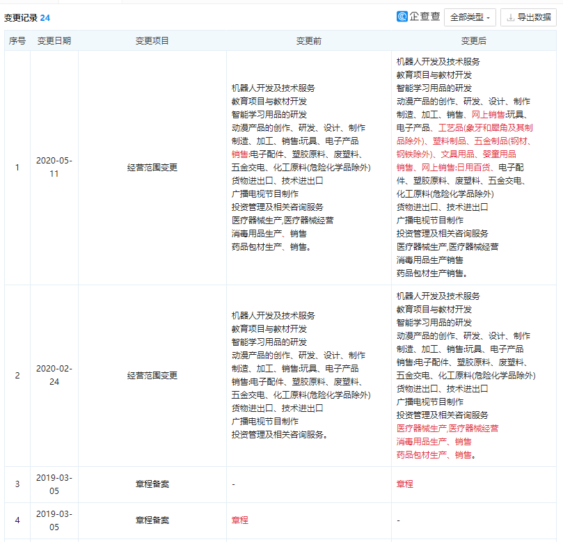 公开信息显示,佳奇科技的经营范围曾多次变更。数据显示,佳奇科技在2020年2月24日变更的经营范围中增加了医疗器械相关的生产,一家玩具生产商增加生产医疗器械,颇有蹭热点嫌疑。