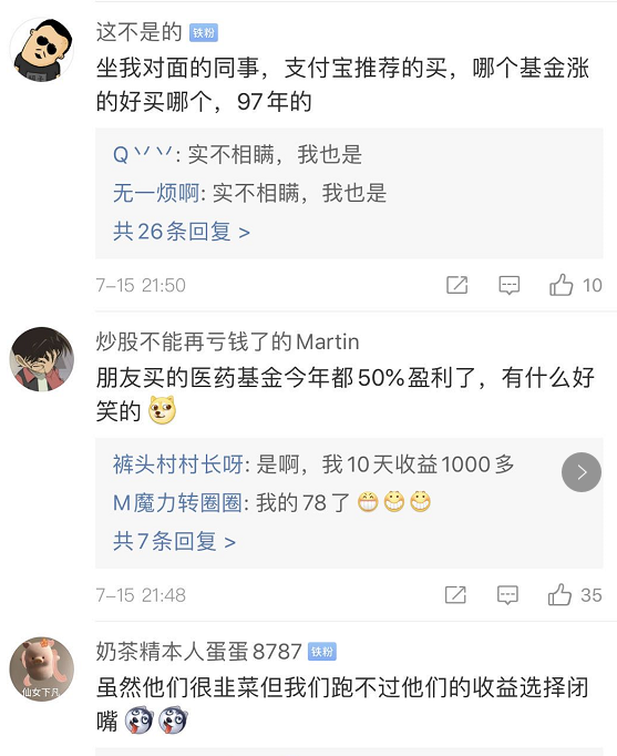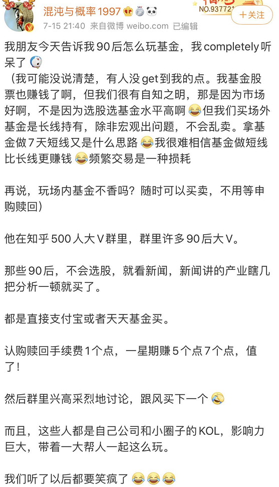 有不少90后,买基金只做7天的短线操作,不会选股,就看新闻,新闻讲的产业瞎分析一顿就买了。都是直接支付宝或者天天基金买。认购赎回手续费1个点,一星期赚5个点7个点,值了!然后群里兴高采烈地讨论,跟风买下一个。