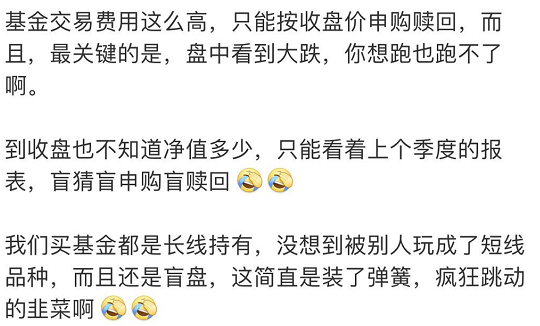 大V感概,“我们买基金都是长线持有,没想到被别人玩成了短线品种,而且还是盲盘,这简直是装了弹簧,疯狂跳动的韭菜啊”