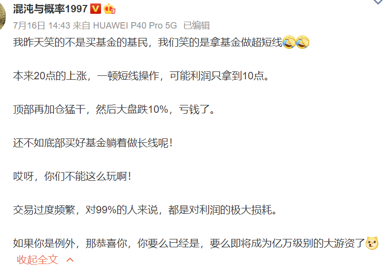 大V在微博称,拿基金做超短线,本来20点的上涨,一顿短线操作,可能利润只拿到10点。顶部再加仓猛干,然后大盘跌10%,亏钱了。还不如底部买好基金躺着做长线呢!交易过度频繁,对99%的人来说,都是对利润的极大损耗。