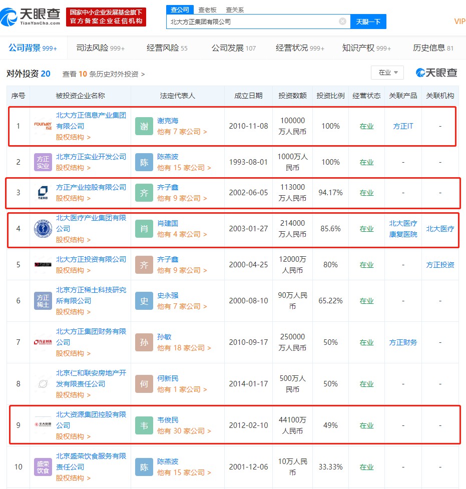 天眼查数据显示,4家公司的法定代表人中,谢克海为方正集团经理,肖建国为方正集团董事,且董事、监事名单中多有重合。不过,上述公司在业务和财产上是否存在混同,尚有待调查证实。