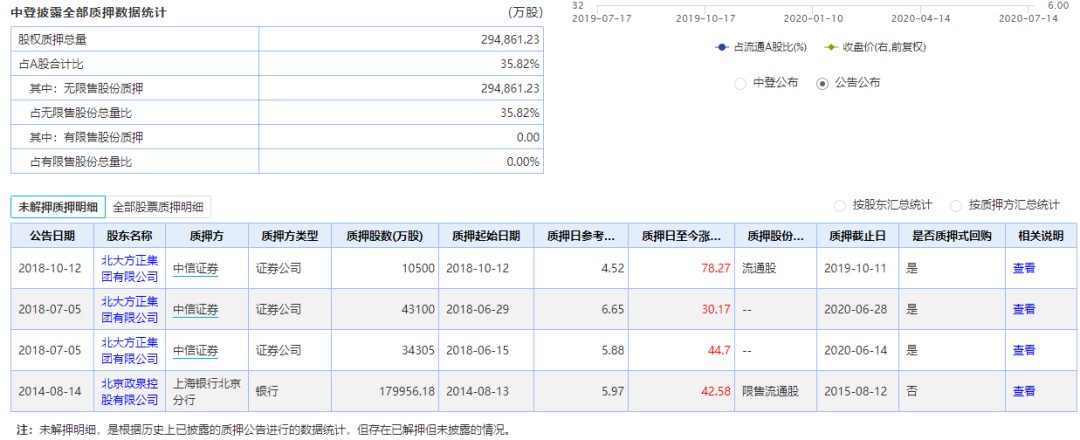 中国结算数据显示,目前方正证券股票质押总量达到29.47亿股,占其A股总股本的35.82%,全部为无限售股份质押。由于方正集团涉及大量诉讼,方正证券的这部分股权也频繁陷入司法冻结——司法轮候冻结——解除司法轮候冻结的程序中。