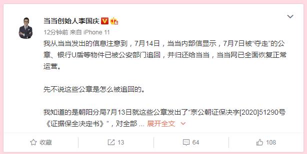 以下是微博全文:我从当当发出的信息注意到,7月14日,当当内部信显示,7月7日被“夺走”的公章、银行U盾等物件已被公安部门追回,并归还给当当,当当网已全面恢复正常运营。