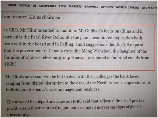 英国《金融时报》倒是在其报道中简单提到了华为的事情,称美国要求汇丰配合逮捕华为高管的事情,直接冲击到了范宁希望关注中国市场的政策。