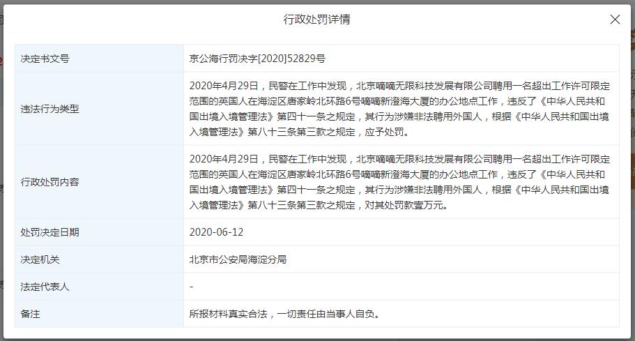 决定书文号“京公海行罚决字[2020]52829号”显示,4月29日,民警在工作中发现,北京嘀嘀无限科技发展有限公司聘用一名超出工作许可限定范围的英国人在海淀区唐家岭北环路6号嘀嘀新澄海大厦的办公地点工作。