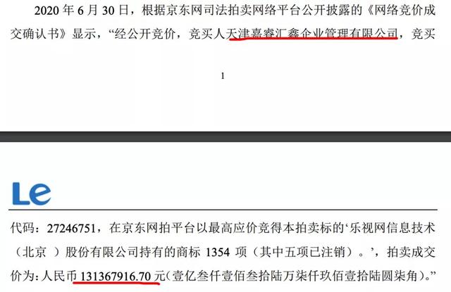 根据7月1日晚间发布的公告,乐视网将“LE”、“LEMI”、“LETV”、“LE乐视网”、“乐视TV”、“乐视TV超级电视”等商标拍卖,以1.31亿元成交。拍得商标的是天津嘉睿汇鑫,乐视网的第二大股东。