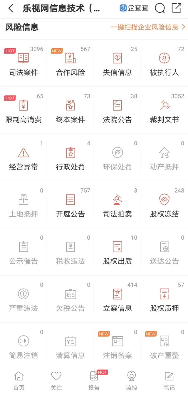 而据企查查信息显示,目前乐视网有3096起司法案件、25条失信信息和414条立案信息。